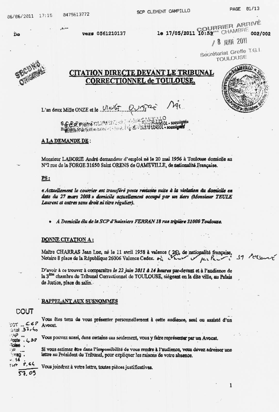Jean Luc notaire envoyé à Monsieur LABORIE André au, N° 2 rue de la Forge 31650