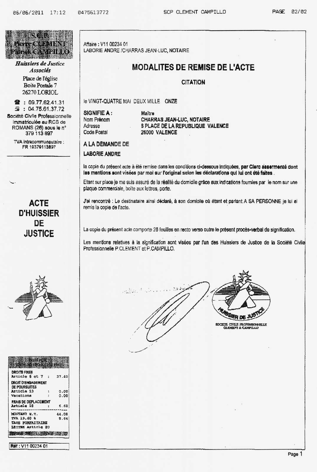 élu de la SCP d’huissier FERRAN et à la demande de Maître CHARRAS Jean Luc en