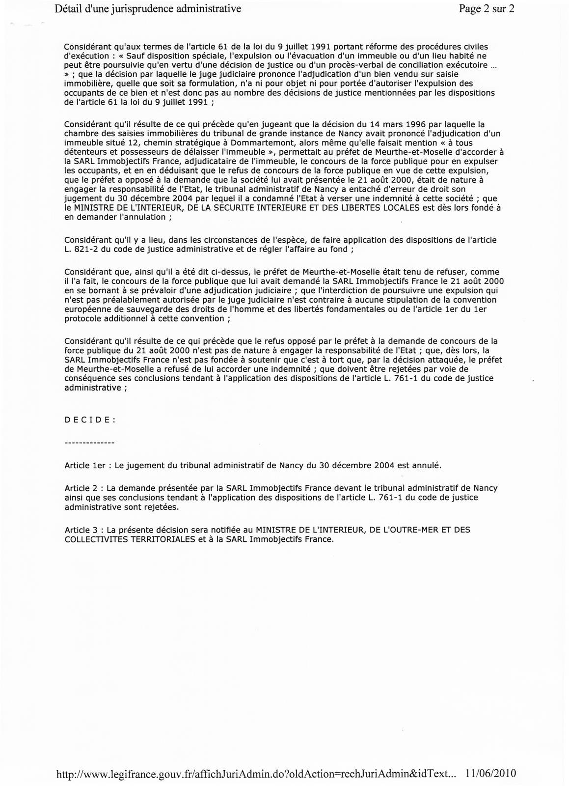 UNE DECISION D'ADJUDICATION NE PERMET PAS L'EXPULSION