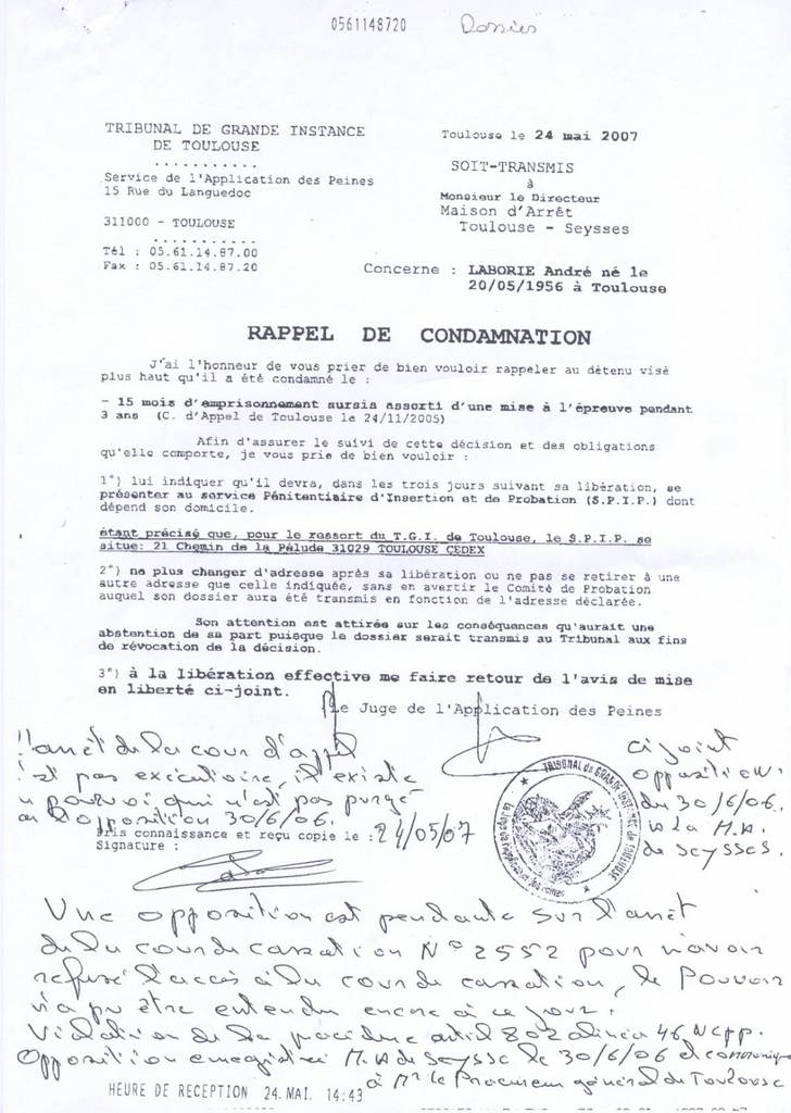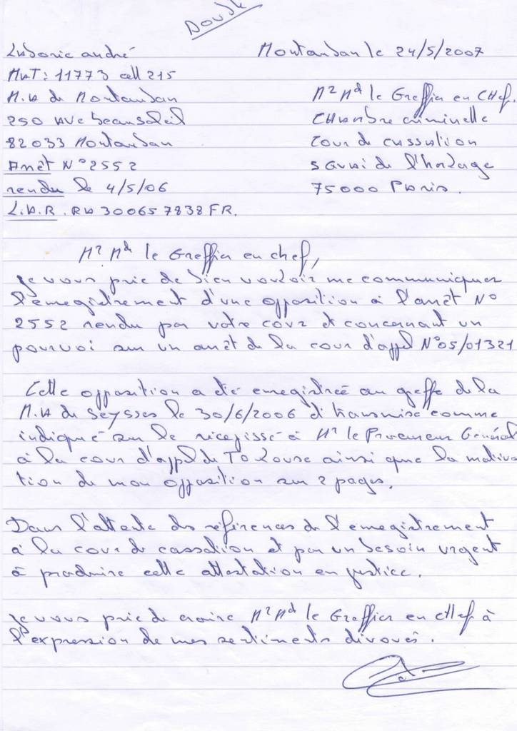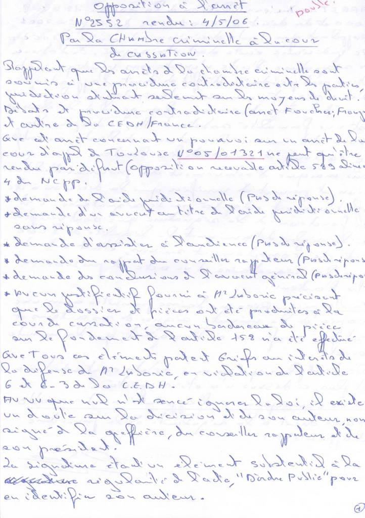Alors qu'une oppostion a été faite, la cour de cassation n'a jamais rendu une décision de recevabilité ou de non recevalité. Saisine du Juge de l'aplication des peines