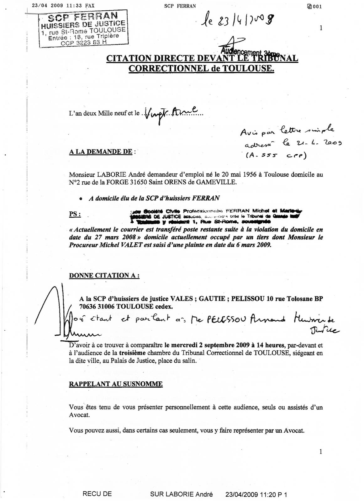 CITATION DIRECTE DEVANT LE TRIBUNAL CORRECTIONNEL de TOULOUSE.