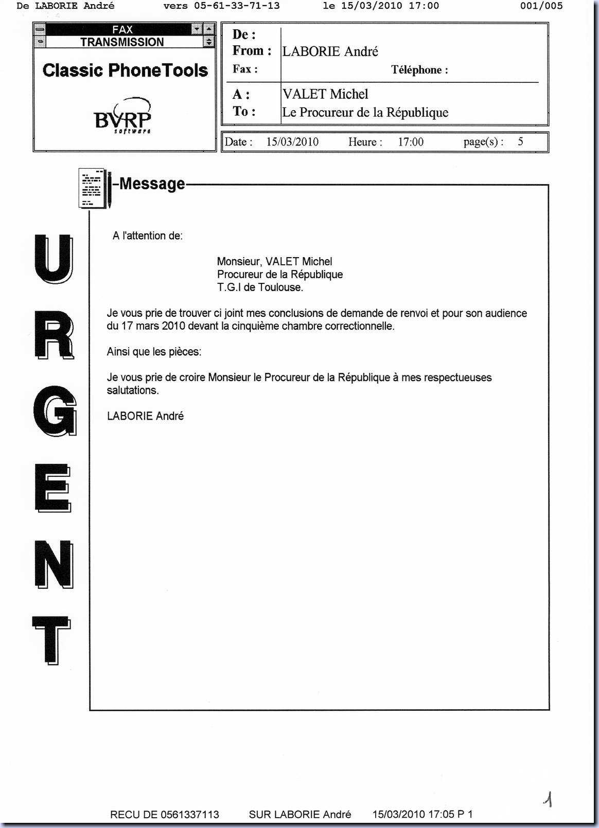 Communication des conclusions de demande de renvoi à Monsieur VALET Michel Procureur de la République.