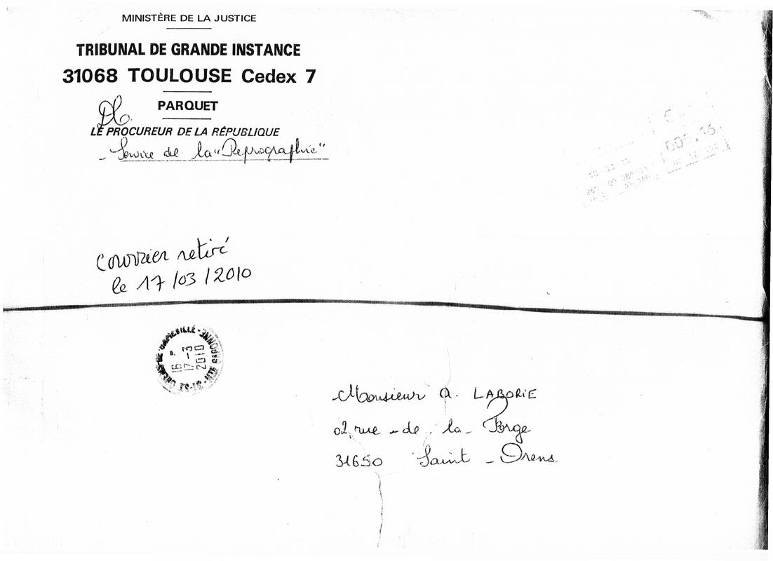 Il est encore une fois prouvé que Monsieur LABORIE André reçoit bien son courrier à son domicile N° 2 rue de la forge 31650 Saint Orens, domicile qui a été violé sous le commandement des autorités toulousaines en date du 27 mars 2008.