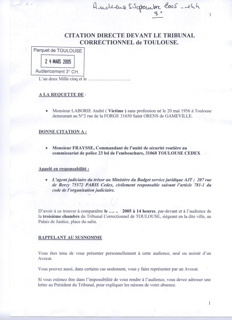 Monsieur FRAYSSE, commandant de l’unité de sécurité routière dans un temps non prescrit par la loi soit le 22 mars 2005 a pris l’initiative et en collaboration de ses exécutants de porter connaissance de faits faux au Procureur de la République, tout en connaissant le caractère inexact pour obtenir une date à faire comparaître Monsieur André LABORIE à l’audience correctionnelle du 10 mai 2005, prétextant qu’il ne possédait pas de permis de conduire alors que c’est Monsieur FRAYSSE sous ses ordres que sont intervenus ses intervenants dans des conditions autres qu’un pays démocratique.