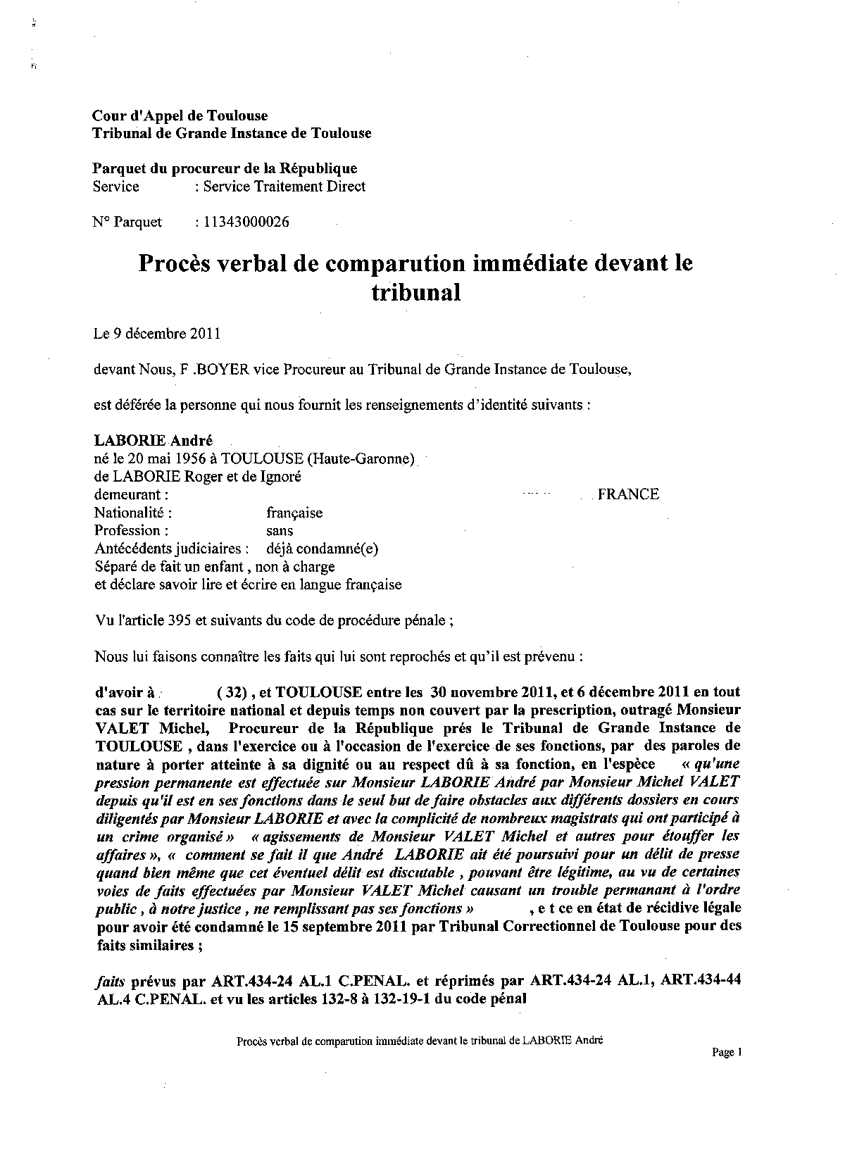 | RECIDIVE DE VALET MICHEL PROCUREUR DE LA REPUBLIQUE | TOUTE LA PROCEDURE DU 8 DECEMBRE 2011 |