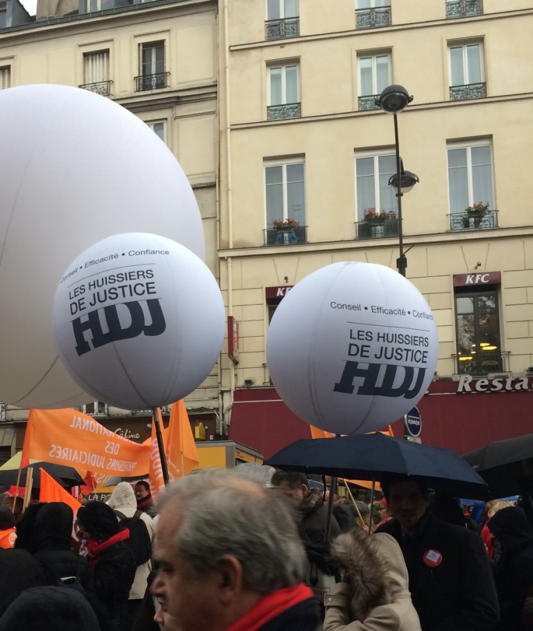 La manifestation rassemblait pour la première fois de leur histoire, six profession juridiques -quelques 50 000 Notaires, avocats, huissiers de justice, greffiers des tribunaux de commerce, commissaires-priseurs judiciaires et mandataires judiciaires-, concernées par le projet de loi et dénonçant plusieurs de ses mesures : les huissiers de justice ont massivement rejoint la manifestation, à laquelle participait le bureau de la Chambre nationale des huissiers de justice.